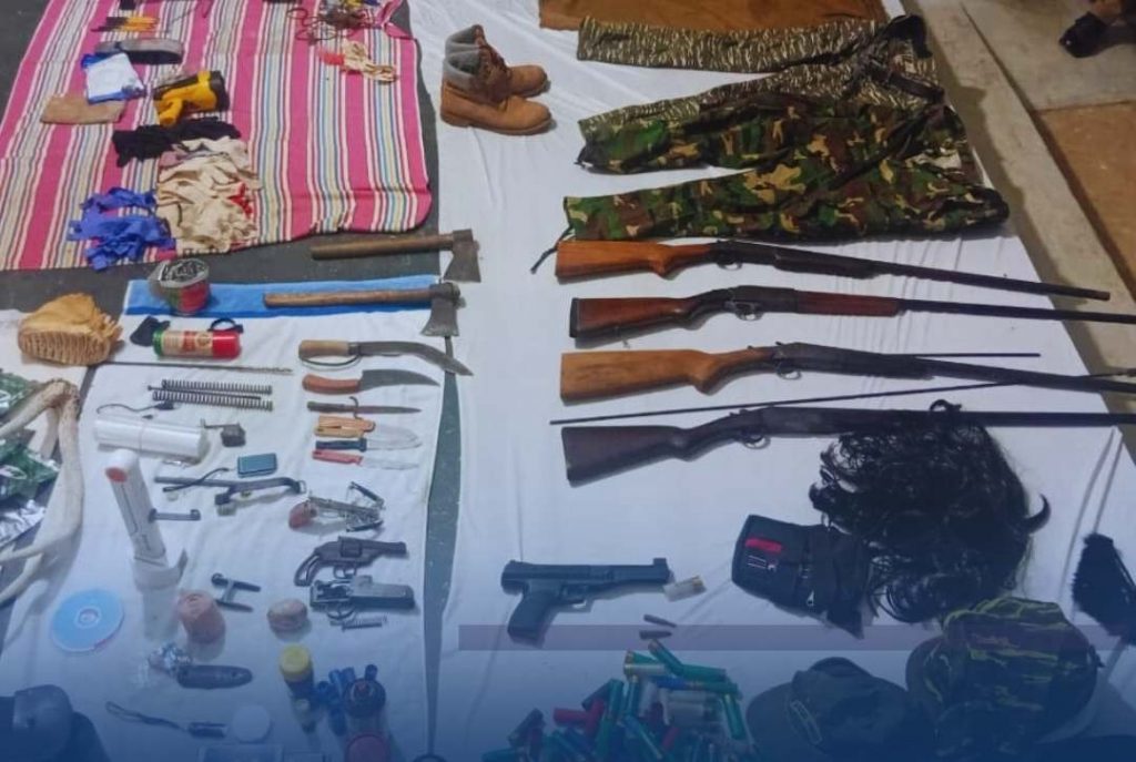 Villagers of the Yahalatenna area, Peradeniya, have captured six people who had come to the area for hunting animals in the dawn of 09.03.2025 and handed them over to the Peradeniya Police Station. According to the information provided by the villagers, officers of the Peradeniya Police Station, who were on night patrol, went to the relevant place and took the six suspects into their custody, and while searching, they found 03 No. of 12 bore cartridges, 03 blank cartridges, an axe, a hand axe, 02 dragon lights, and a knife in their possession. It was also witnessed that they had brought a carcass of a wild boar with them, and through questioning, a 12 bore firearm that was kept in a forest area by the side of the road in the Yahalatenna area was found at the same time. Since these suspects are residents of the Mawathagama area who are aged between 28 and 71 years, steps have been taken to inform the Mawathagama Police Station. Accordingly, officers of the Mawathagama Police Station searched a house in the Kotikapala area of Mawathagama, where one of the above suspects resides, and found items including 04 No. of 12 bore firearms, ammunition of tem, a revolver, 03 hand axes, a set of clothes similar to military uniforms, a wig, 02 pairs of handcuffs, and an air pistol in the said house. The Peradeniya and Mawathagama Police Stations carry out further investigations regarding these suspects.