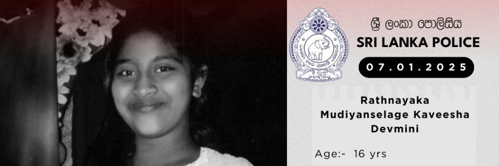The Police are conducting investigations to locate a 15-year-old girl who absconded from a children’s home in Chilaw on 17.07.2025. She had previously escaped from the Meegahakotuwa Government Detention Home, where she was under detention, and was later taken into custody by the Chilaw Police on 14.07.2025. Subsequently, she was produced before the Magistrate’s Court and placed in the children’s home, from where she later escaped. Name: Willaff Francisco Mayumi Pratara Age: 15 years Permanent Address: No. 06, Henegedara, Udubaddawa Anyone with information regarding her whereabouts or any details that may assist in locating her is kindly requested to contact the following numbers immediately: Officer-in-Charge (OIC), Kuliyapitiya Police Station: 071 859 1263 Kuliyapitiya Police Station: 037-2281222