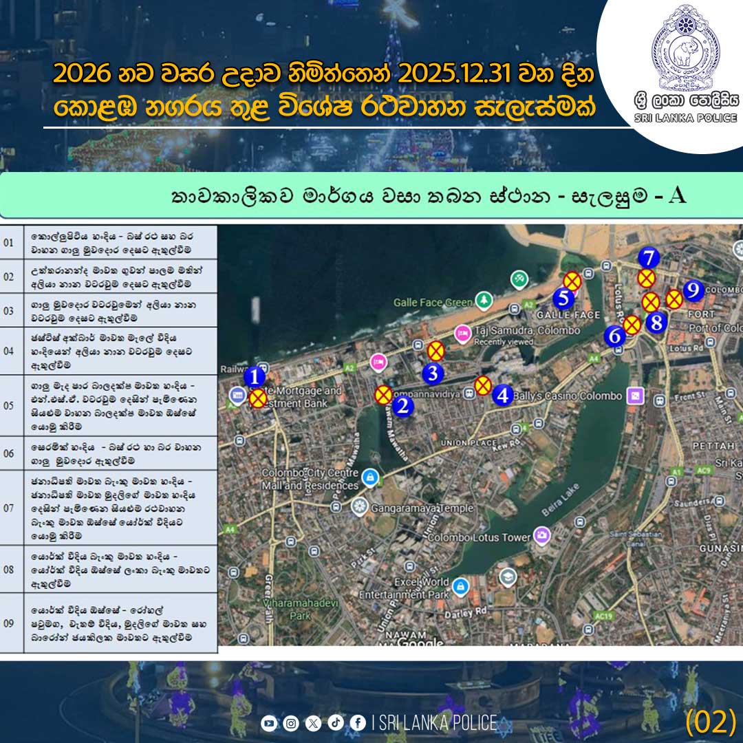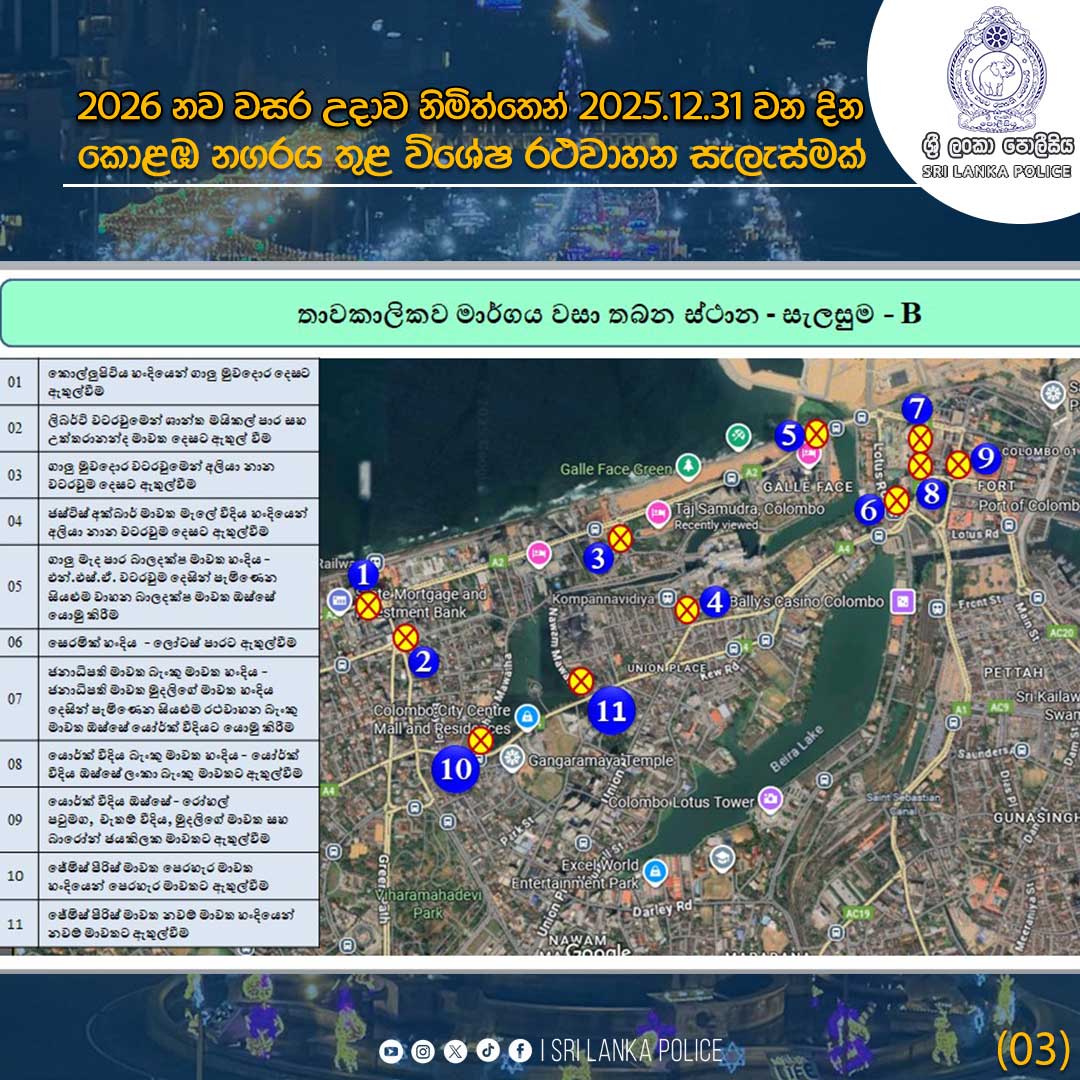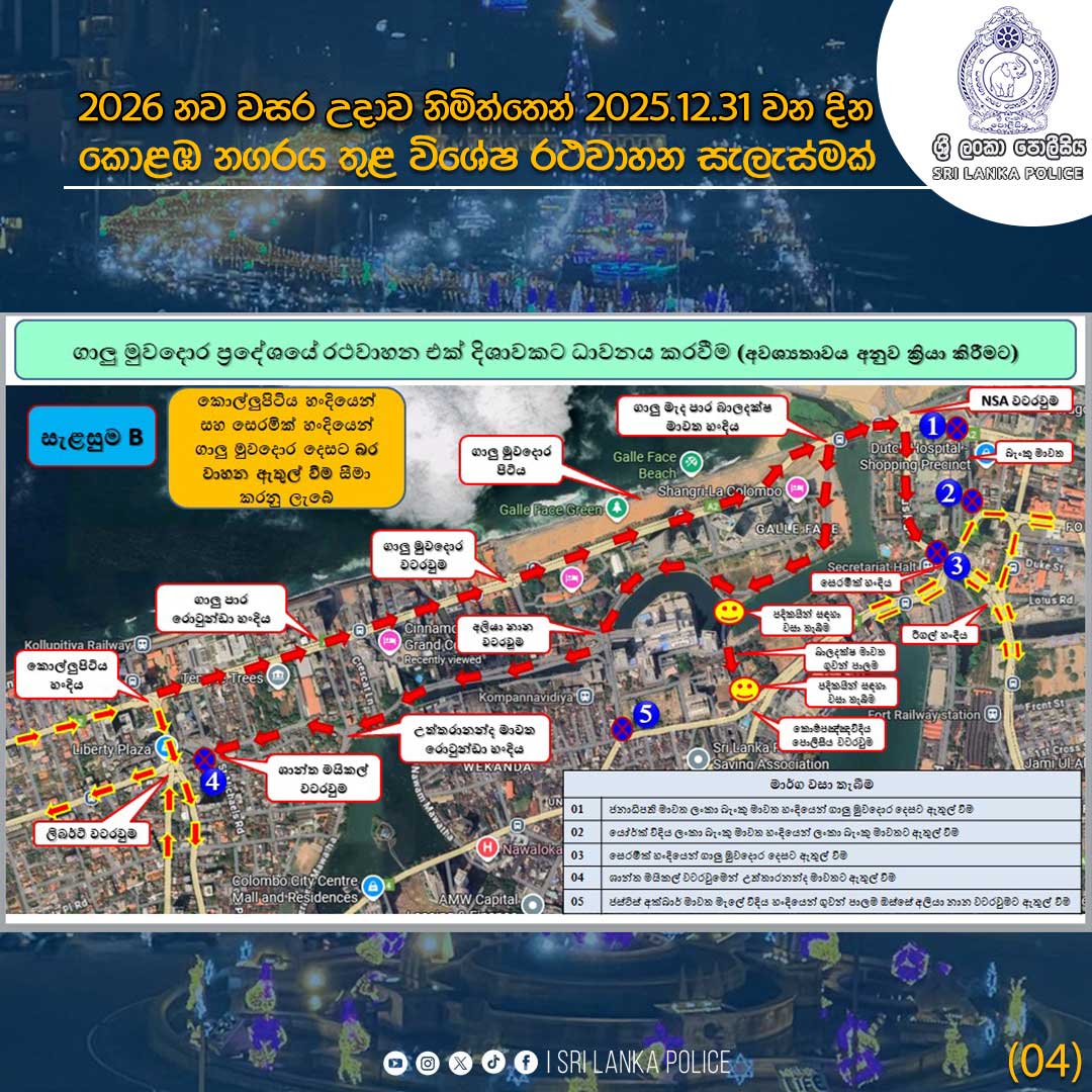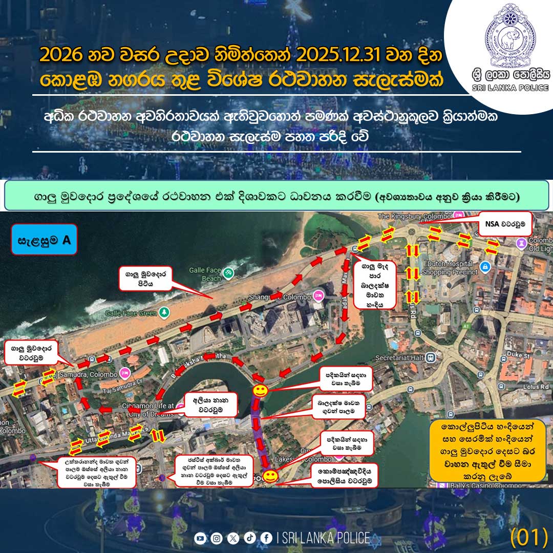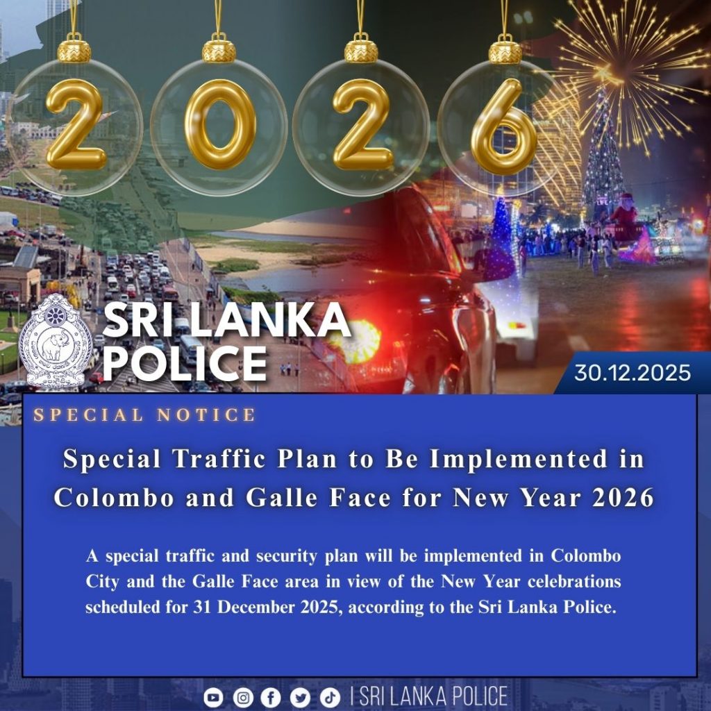A special traffic and security plan will be implemented in Colombo City and the Galle Face area in view of the New Year celebrations scheduled for 31 December 2025, according to the Sri Lanka Police.