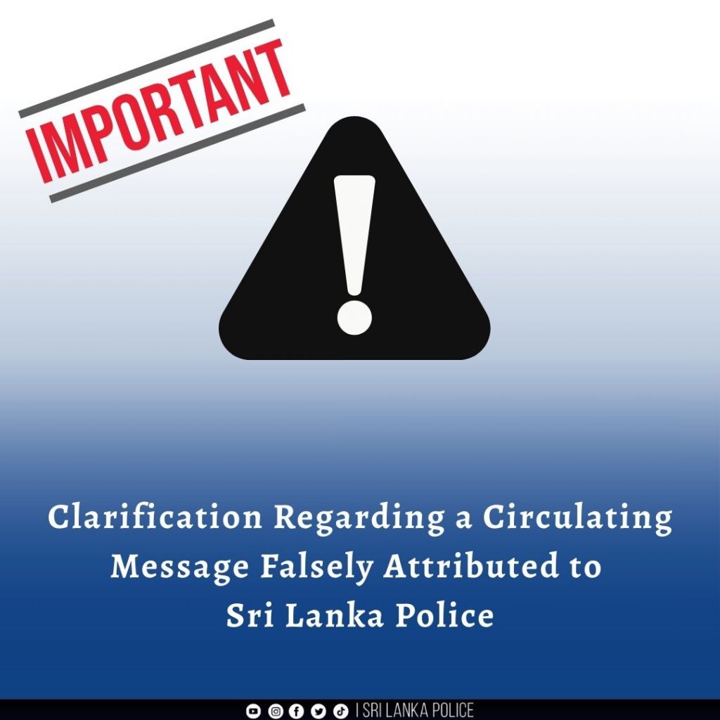 Sri Lanka Police wish to inform the general public that a message currently circulating on social media and messaging platforms, titled as a “Police Notice” and containing a list of safety instructions, has NOT been issued by Sri Lanka Police. The contents, wording, and directives in that message are unauthorised and misleading, and the public is advised not to treat it as an official police communication.