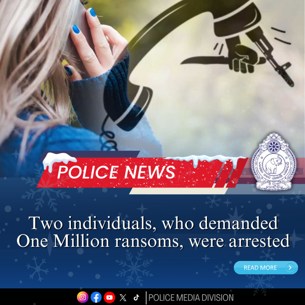Two individuals, who demanded a ransom of one million rupees from a woman in Kelaniya Police Area, after issuing death threats over the phone, have been arrested by the officers of Western Province North Crime Division, on 22 – 12 – 2014 in Dalugama and Pattiya Junction of Kiribathgoda Police Area.