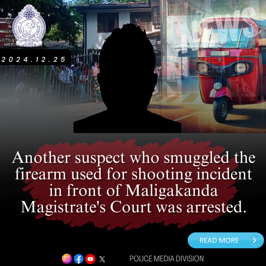 Another suspect who aided and abetted in the shooting incident causing serious injuries to a woman near Maligakanda Magistrate’s Court on 14.12.2024 was arrested by the Colombo Crime Division on 24.12.2024 at Jampettah Street, in the Coastal Police Area.