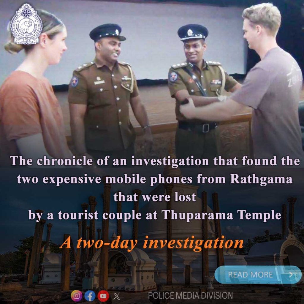 This is the chronicle of an investigation by the Tourist Police Bureau, Anuradhapura, which has found the two mobile phones worth about 500,000 rupees, within a short period of time, which were lost at the Thuparama Temple by an Australian couple, who were in a visit to Sri Lanka for a tour.