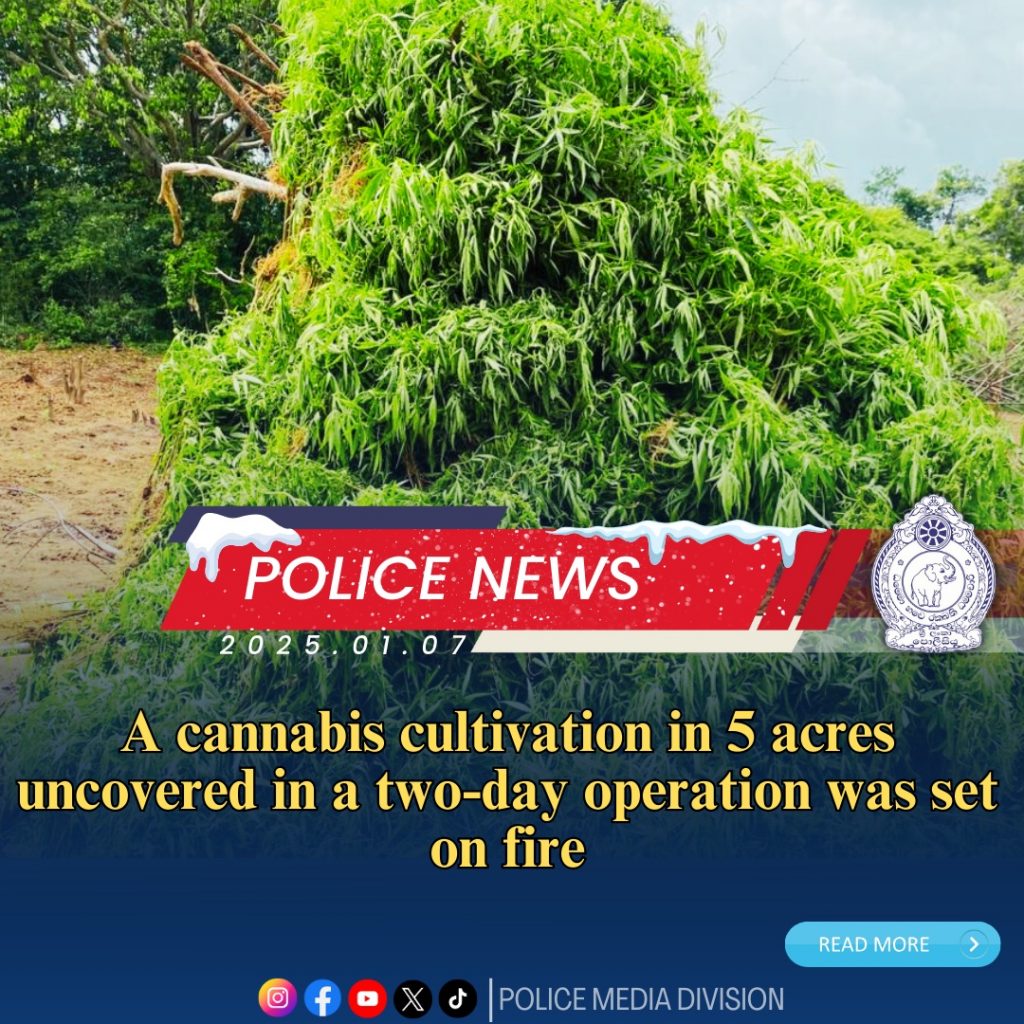During a two-day search operation carried out in Zone 04 of the Yala Reserve, officers of the Gonagan Ara Police Station uncovered 04 cannabis cultivations covering an area of 5¼ acres on 07.01.2025 and were able to destroy about 500,000 cannabis plants, well-grown up to a height of around 4 feet.