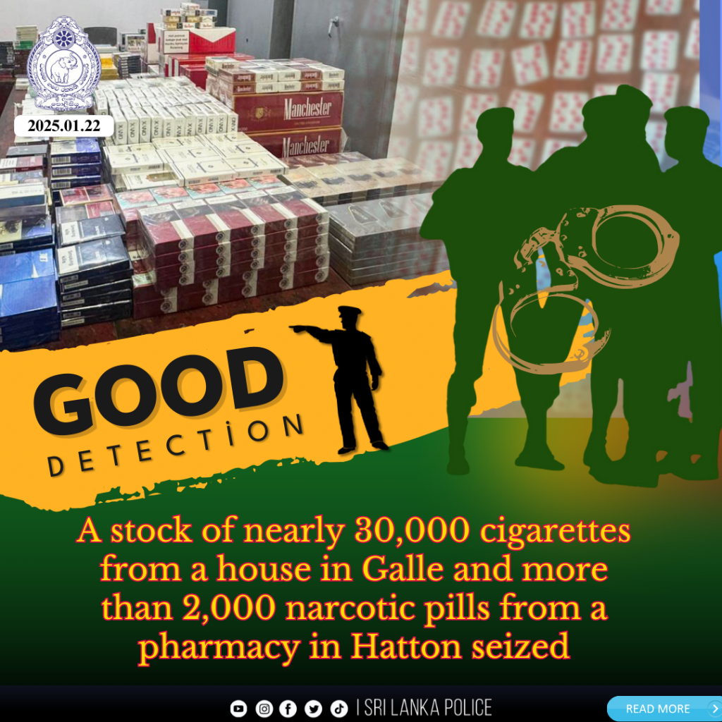 A team of officers from the Police Special Task Force Ratgama Camp raided a house in the Magalla area of the Galle Fort Police Area on 21.01.2025, and a 53-year-old man, who was in possession of 29,600 foreign cigarettes that had been illegally imported into the country without paying duty, was arrested and handed over to the Galle Fort Police Station for further investigation.