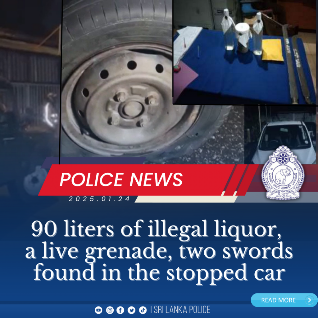 90 liters of illegal liquor, a live grenade, two swords found in the stopped car