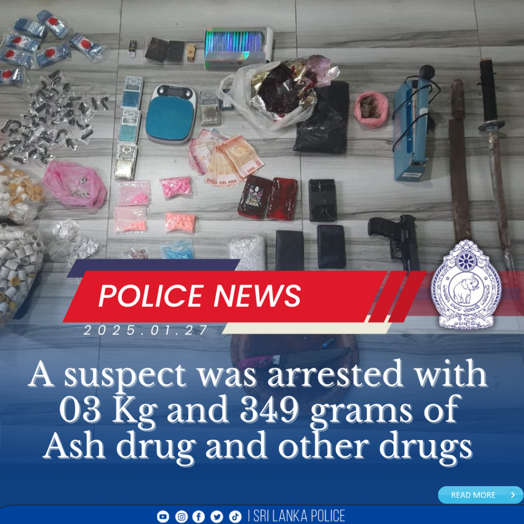 During a raid conducted by the officers of Special Raid Unit at the Special Task Force, 03 Kg and 349 grams of Ash drugs, 25 grams of Kush drugs, 30 grams of Mandirof drugs, 320 tablets, and 129 drug stamps and an air pistol have been seizedල on 24-01-2025 at Wimalasiri de Mel Mawatha, Mount Lavinia.