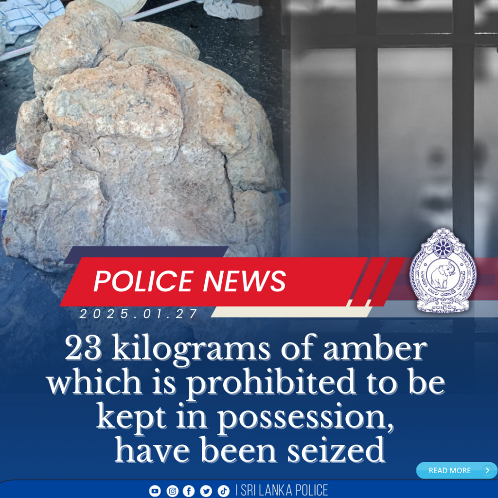 A 32-year-old individual was arrested on 26-01-2025 at Ganegoda of Rathgama Police Area by a group of officers of Police Special Task Force, Rathgama Camp, for keeping possession of 23 kg of amber alias whale waste illegally. He was handed over to the Police Station, Rathgama for further investigation.