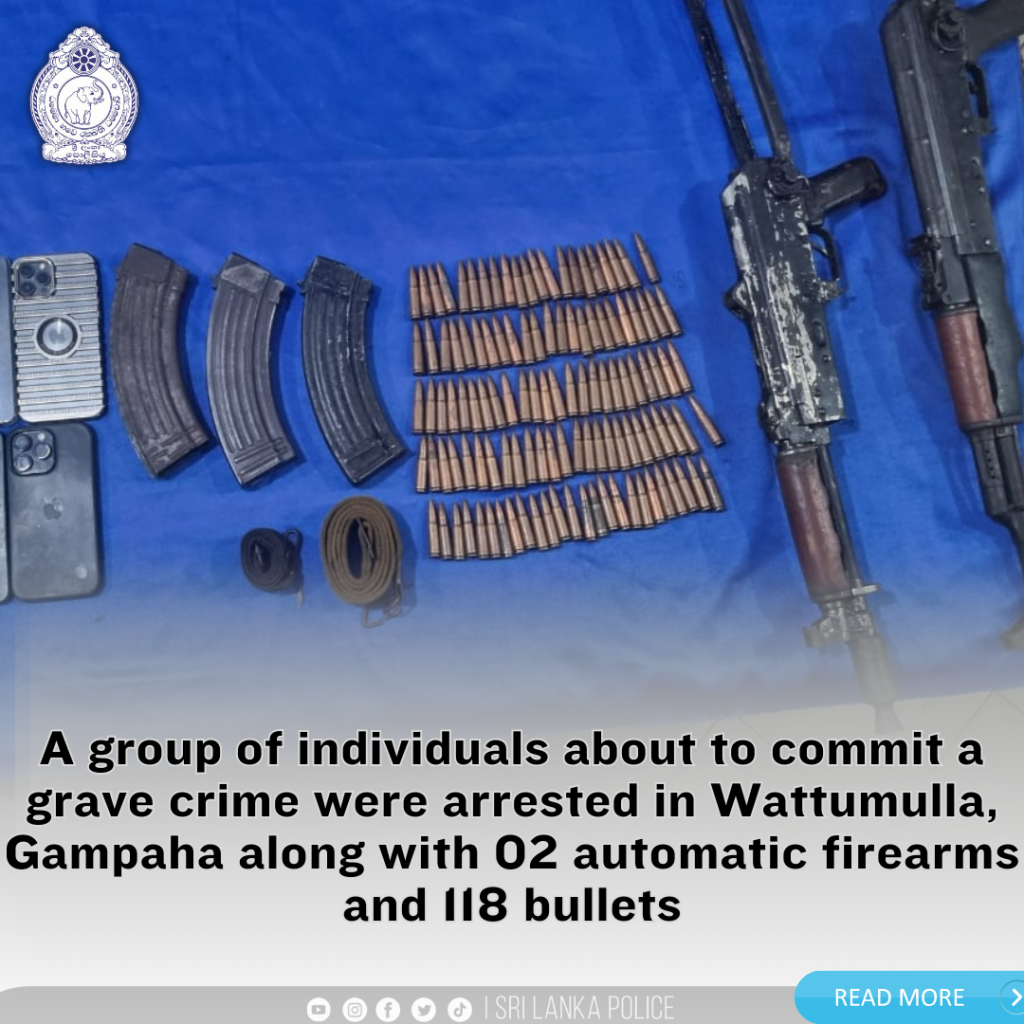 A team of officers of the Police Special Task Force Headquarters was able to arrest six individuals staying in a house in Wathumulla, Gampaha, who were in possession of 02 T-56 firearms, 118 T-56 bullets and 03 magazines, along with a car, a van and a three-wheeler parked there on 19.04.2025.